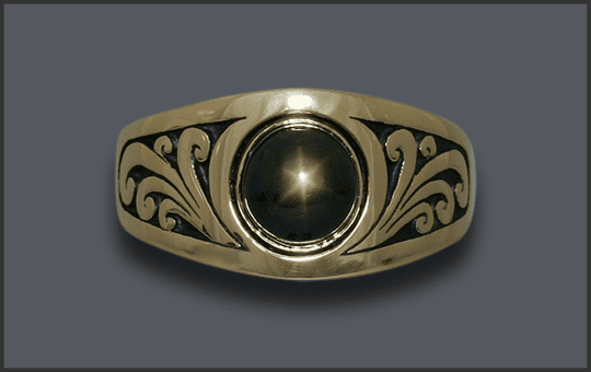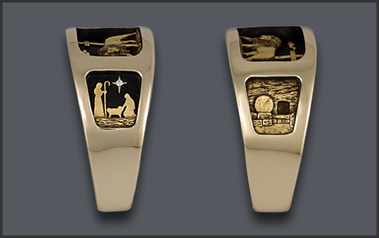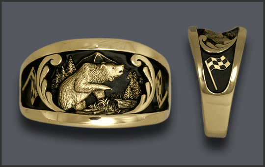 14kt MEN’S custom Bull Elk ring with arrowhead on each side instead of mountains and trees