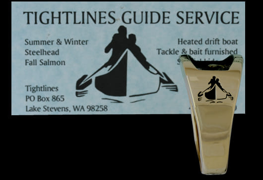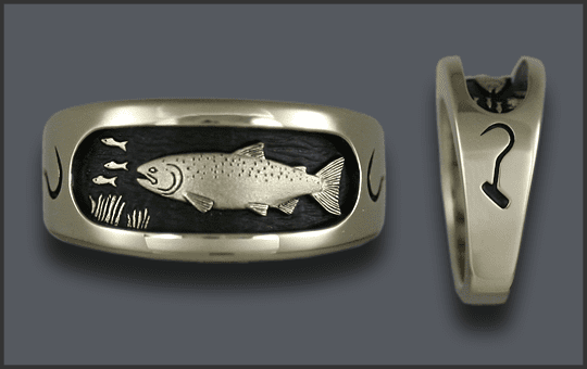 14k white gold MEN'S custom chinook salmon ring with longshore hook on each side