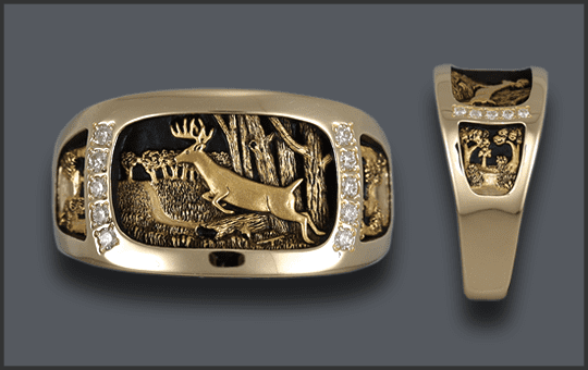 14kt MEN’S custom jumping whitetail deer Ring with diamonds added