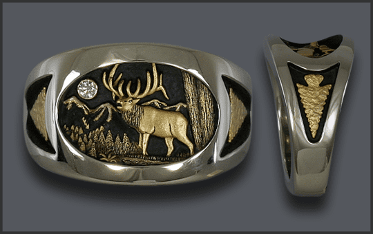 14kt white gold MEN’S custom Bull Elk ring with arrowhead on each side instead of mountains and trees