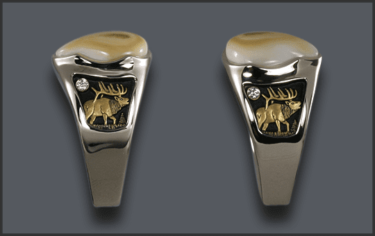 14kt white gold MEN’S custom Elk ivory ring with elk track instead of initials