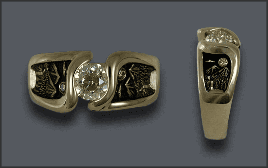 14k WOMEN'S custom .50ct diamond ring with waterfall scene on each side
