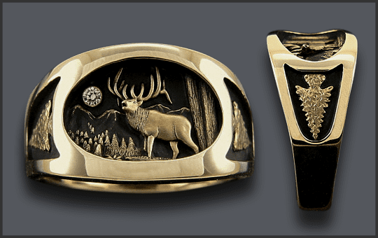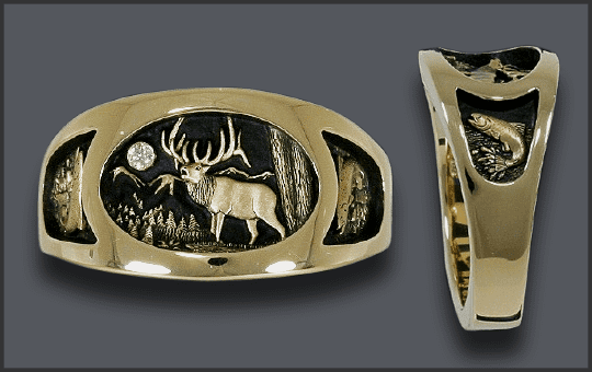 14kt MEN’S custom Bull Elk ring with jumping fish on each side instead of mountains and trees