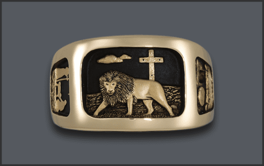 the lion of judah and the rugged cross - with the nativity scene for the birth of jesus christ on one side and the empty tomb for the resurrection of jesus christ on the other side