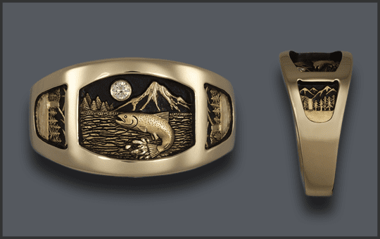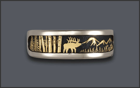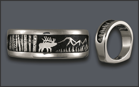 14kt MEN’S ELK RING WITH TREES ON SIDES -